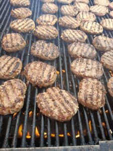 The grill setup at the Pork Producers Tent is no small operation. The grill I worked on is big enough to handle more than 100 items at once — about 50 or more pork burgers on one half, and at least that many pork chops on the other. There were always six to eight people around the grill at any given time, flipping burgers, checking temperatures, and shifting meat around to different heat zones so everything cooked just right. My focus for the day ended up being burger duty. I did get a few chops on the grill, but I kept gravitating back to that wall of sizzling burgers, working through three full rounds during my shift.