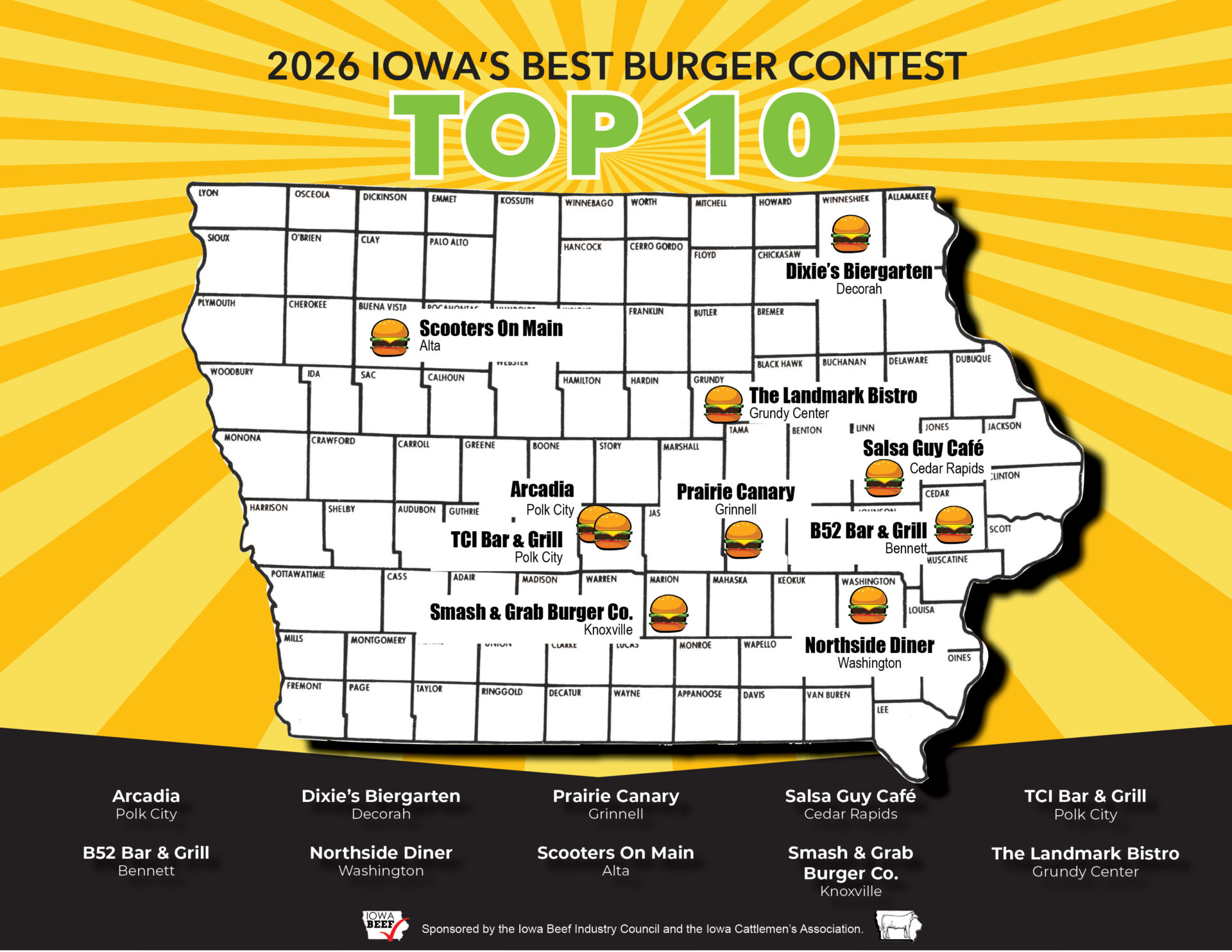 The final phase of the contest begins soon, as a panel of anonymous judges will visit each Top Ten restaurant to evaluate the burgers based on taste, appearance, and proper doneness (160°F). The 2026 Iowa’s Best Burger winner will be announced on May 1 to kick off May Beef Month.
